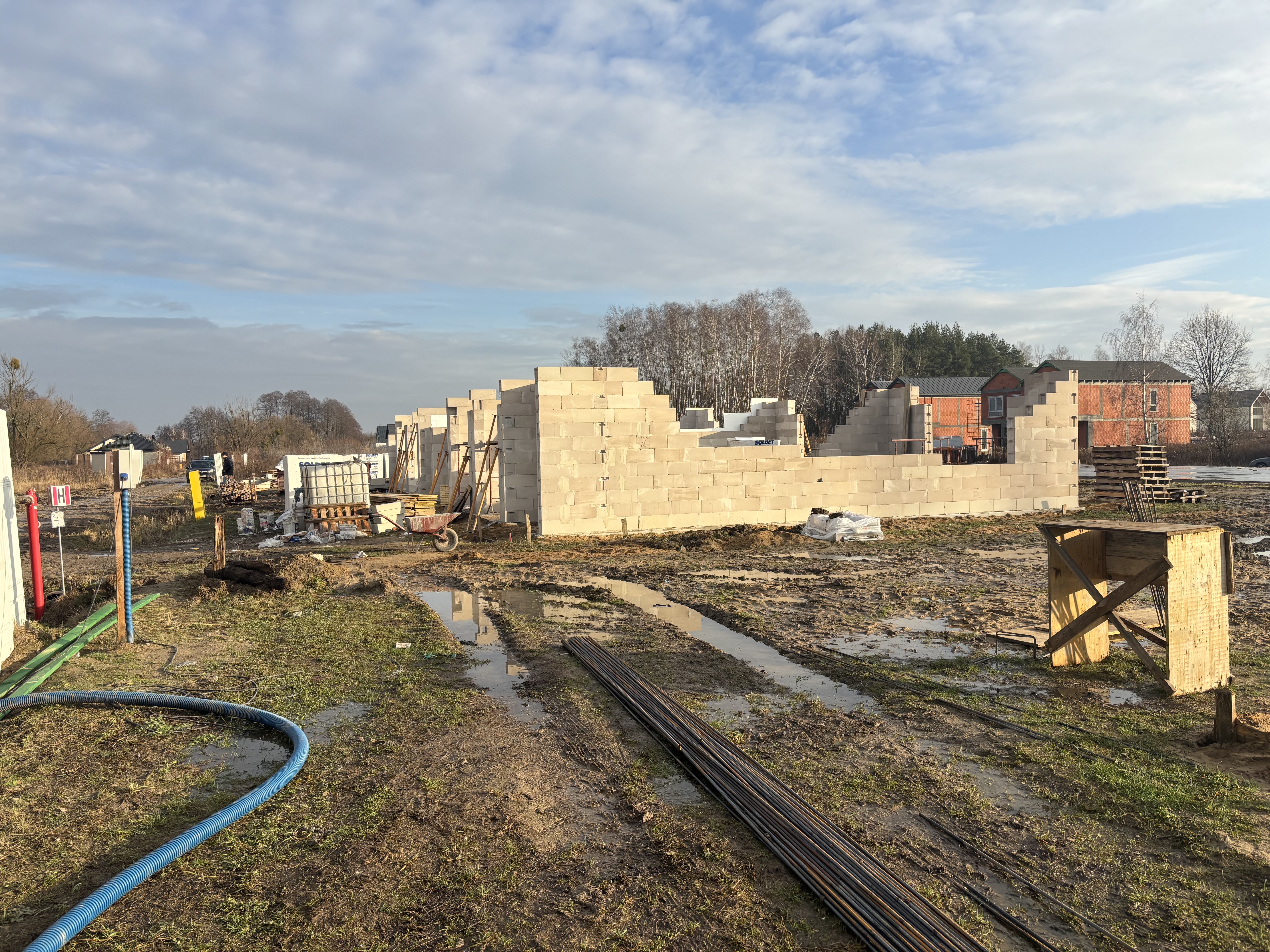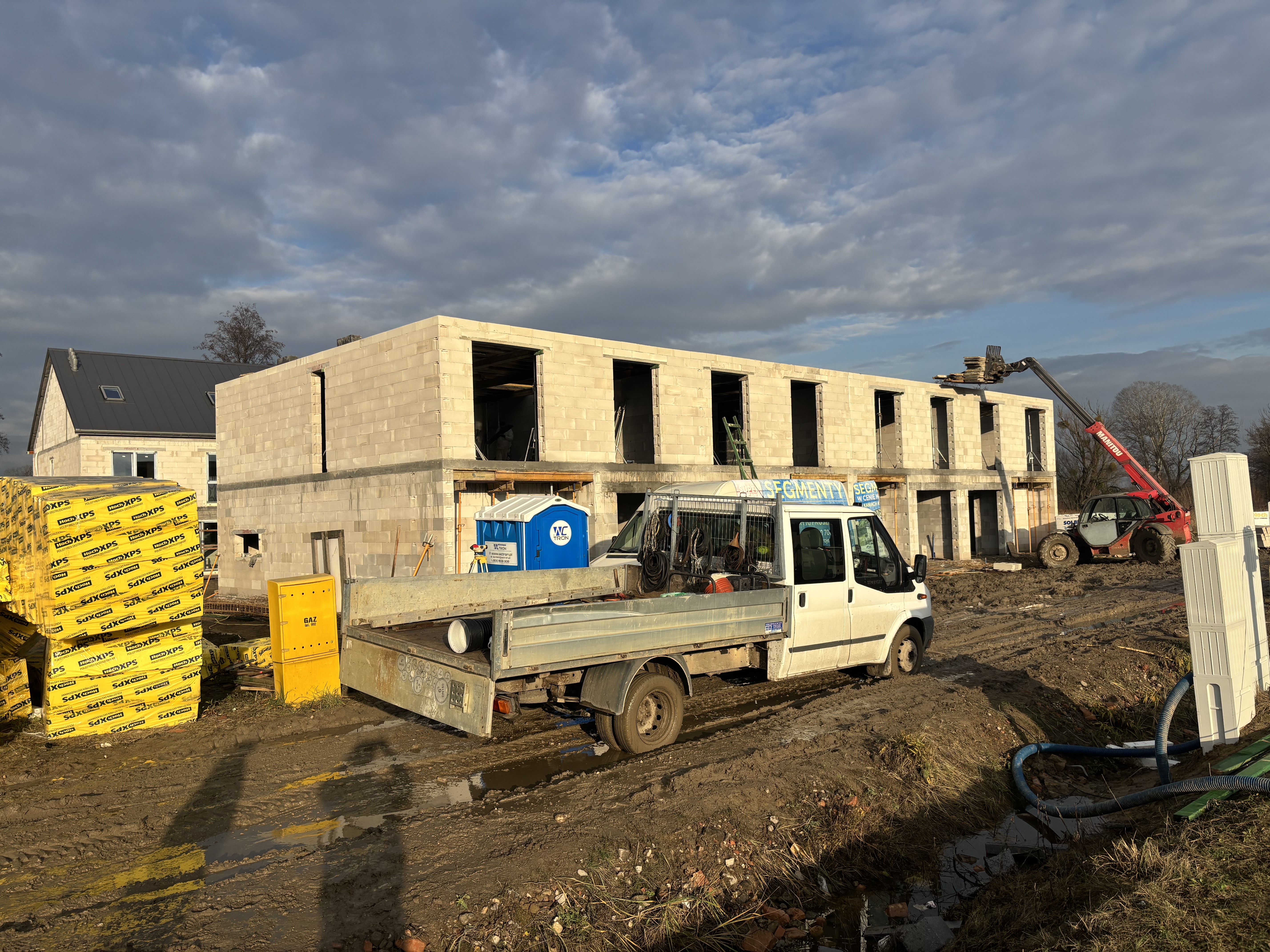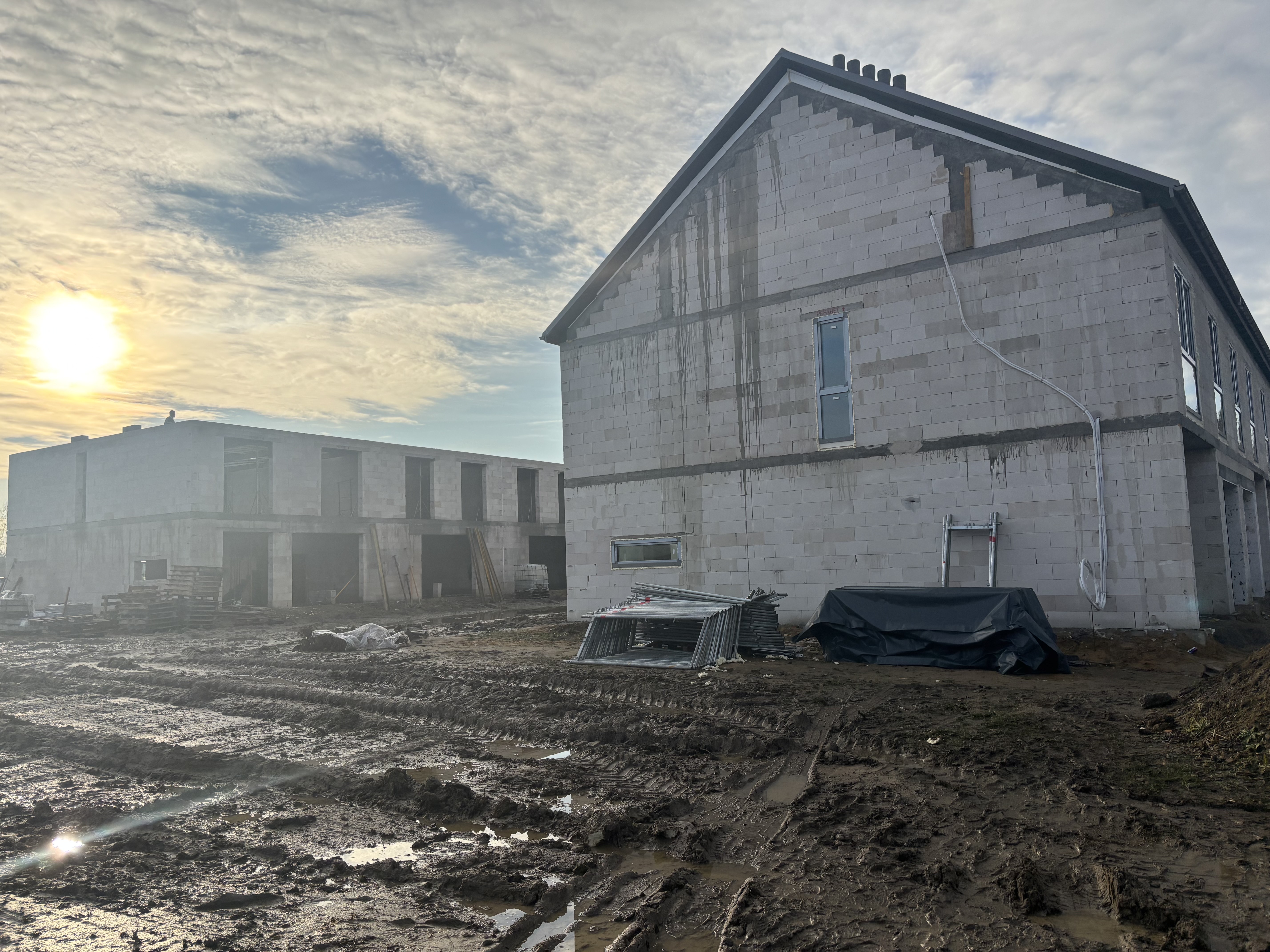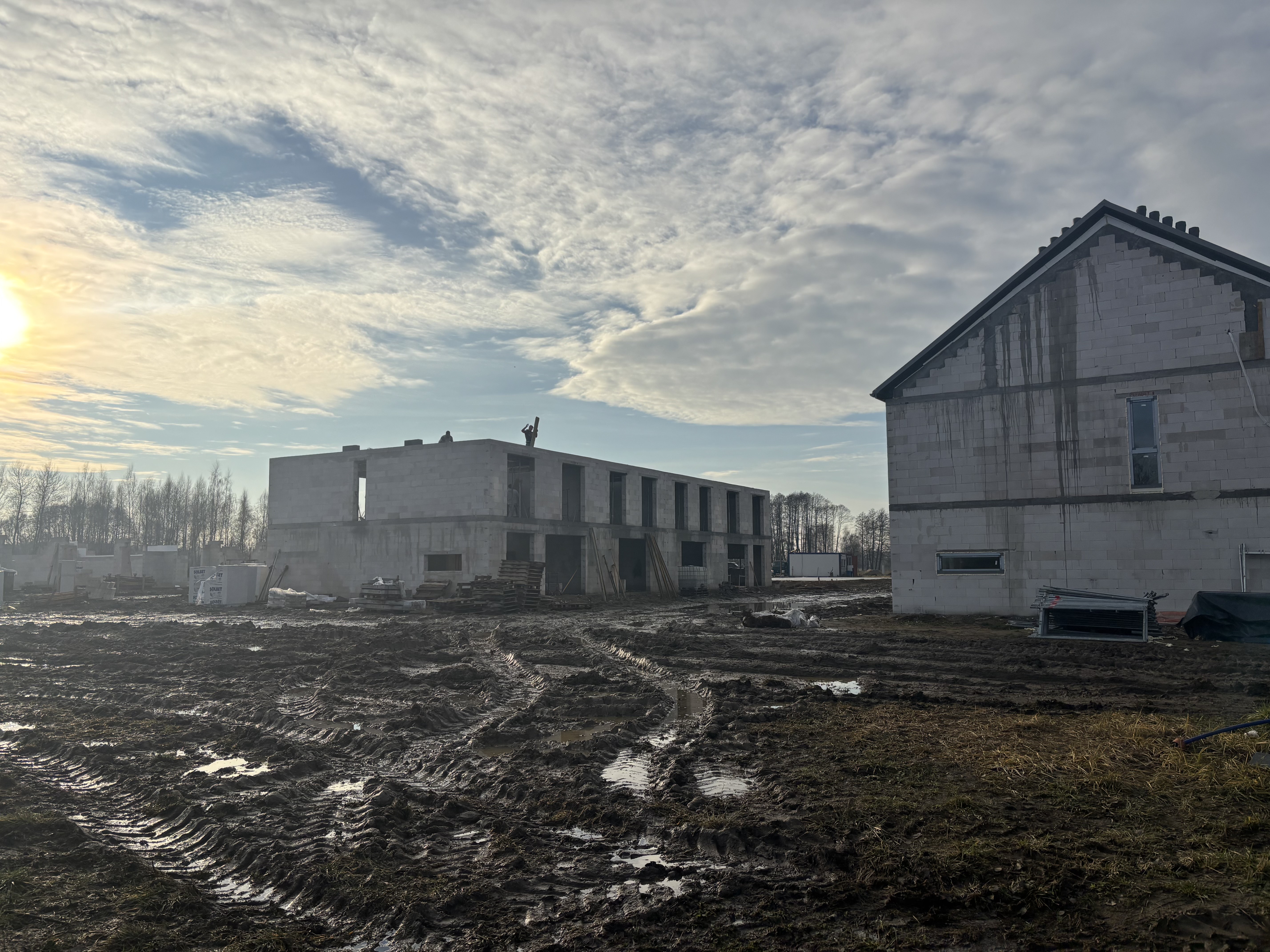 Budynek numer 2 Równolegle, tuż obok, trwają intensywne prace murarskie. Wznosimy ściany zewnętrzne oraz działowe, dzięki czemu powoli wyłaniają się już zarysy poszczególnych pomieszczeń i układ mieszkań. W najbliższym czasie planujemy rozpoczęcie wylewania stropu nad drugą kondygnacją – to będzie kolejny ważny etap, który domknie obecną fazę konstrukcyjną.